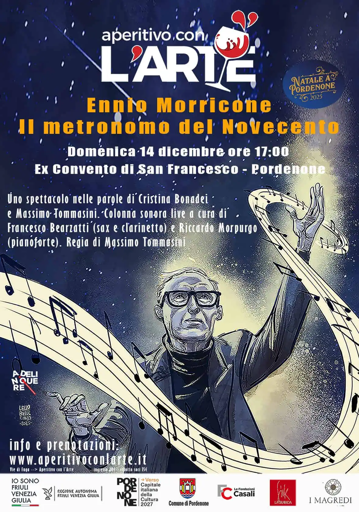ore 17:00 spettacolo: “Ennio Morricone, il metronomo del Novecento” al termine dello spettacolo (18:30 circa) aperitivo con la degustazione vini della Cantina I Magredi di Domanins (PN).